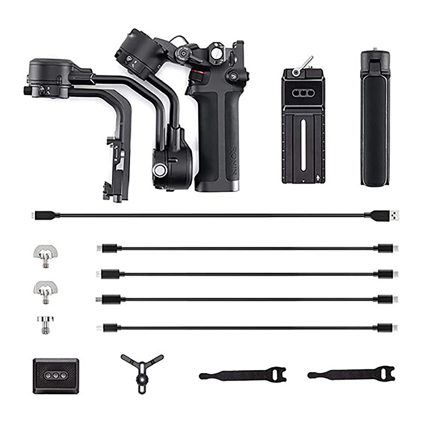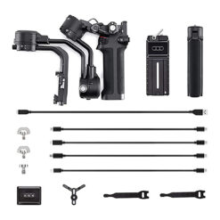 A mini tripod is included with the RSC 2, attaching to a 1/4″-20 thread on the grip handle’s bottom. This tripod serves as a stand or extension handle for two-handed maneuvering of the gimbal during specific shots. The package also includes camera control cables, enabling direct control of select camera functions from the gimbal controls.