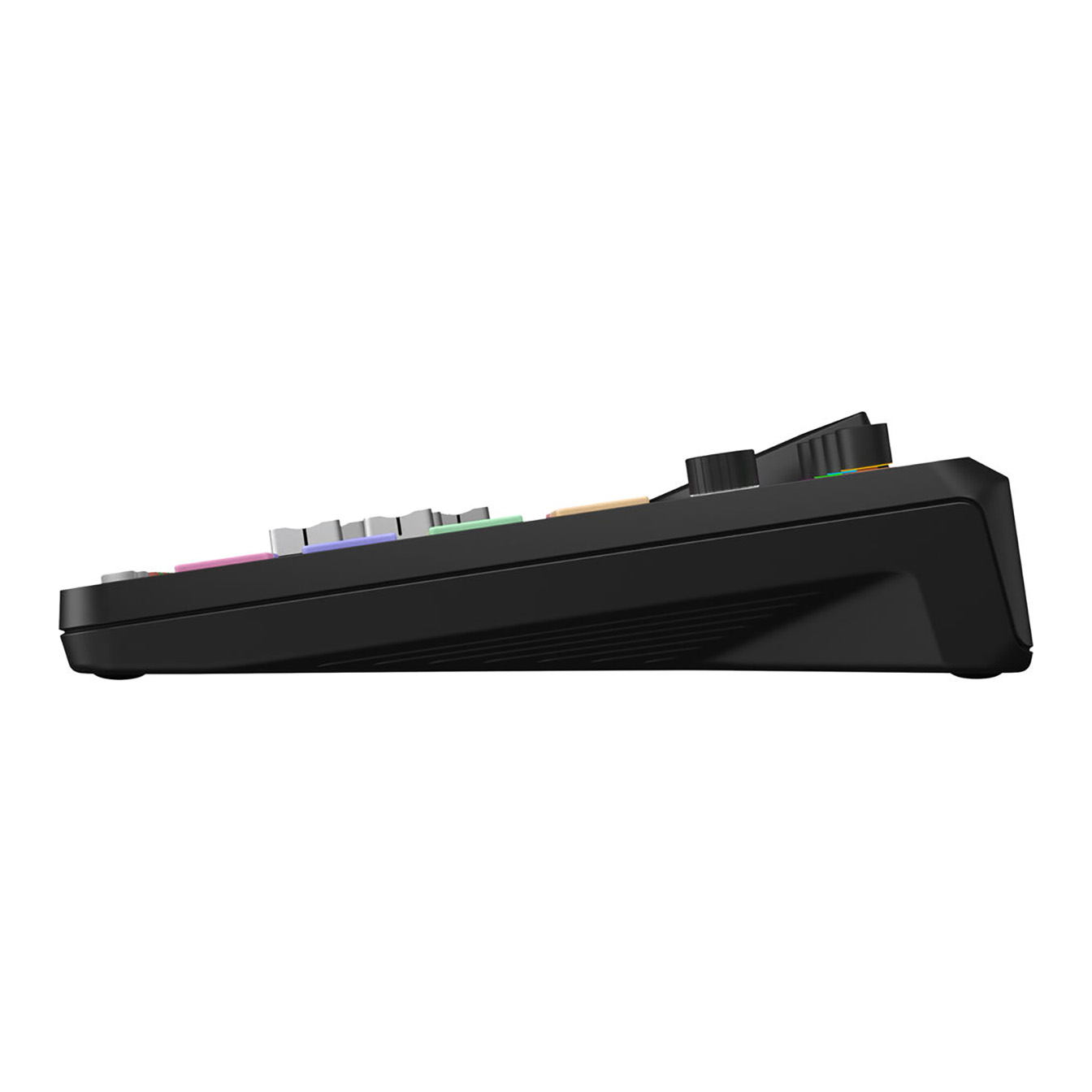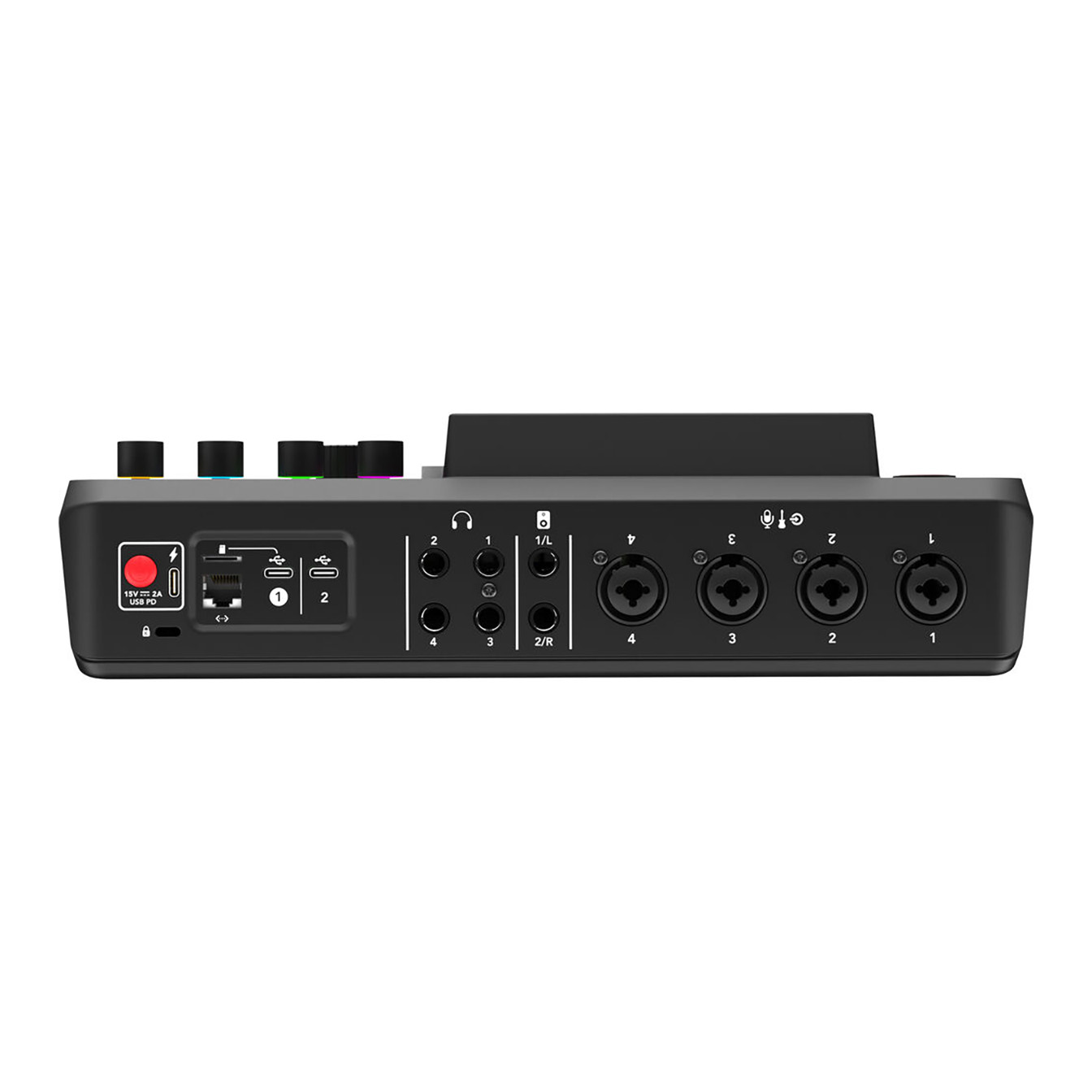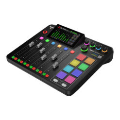 The 5.5″ color touchscreen features haptic feedback and automatic brightness, with a tilted design for optimal viewing. A rotary encoder provides efficient navigation. Dual USB-C interfaces allow two computers or mobile devices to connect simultaneously, offering great options for remote podcasting or complex streaming.