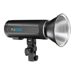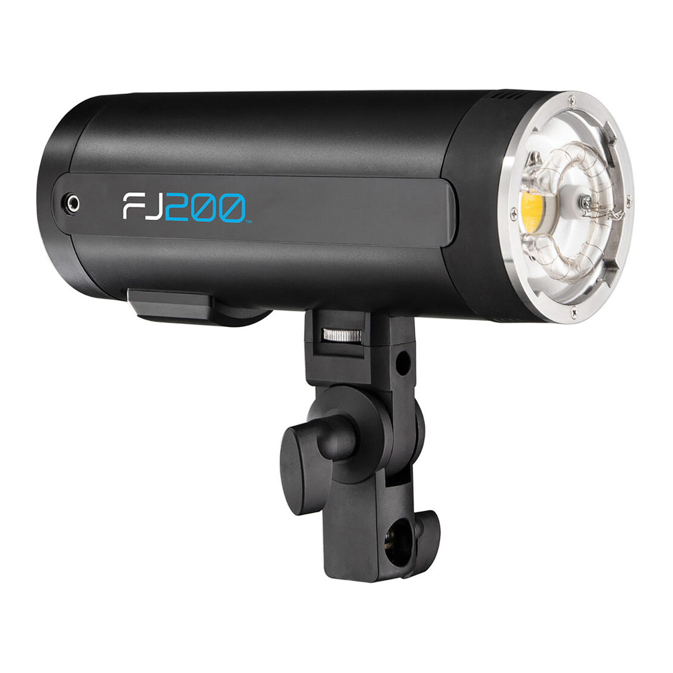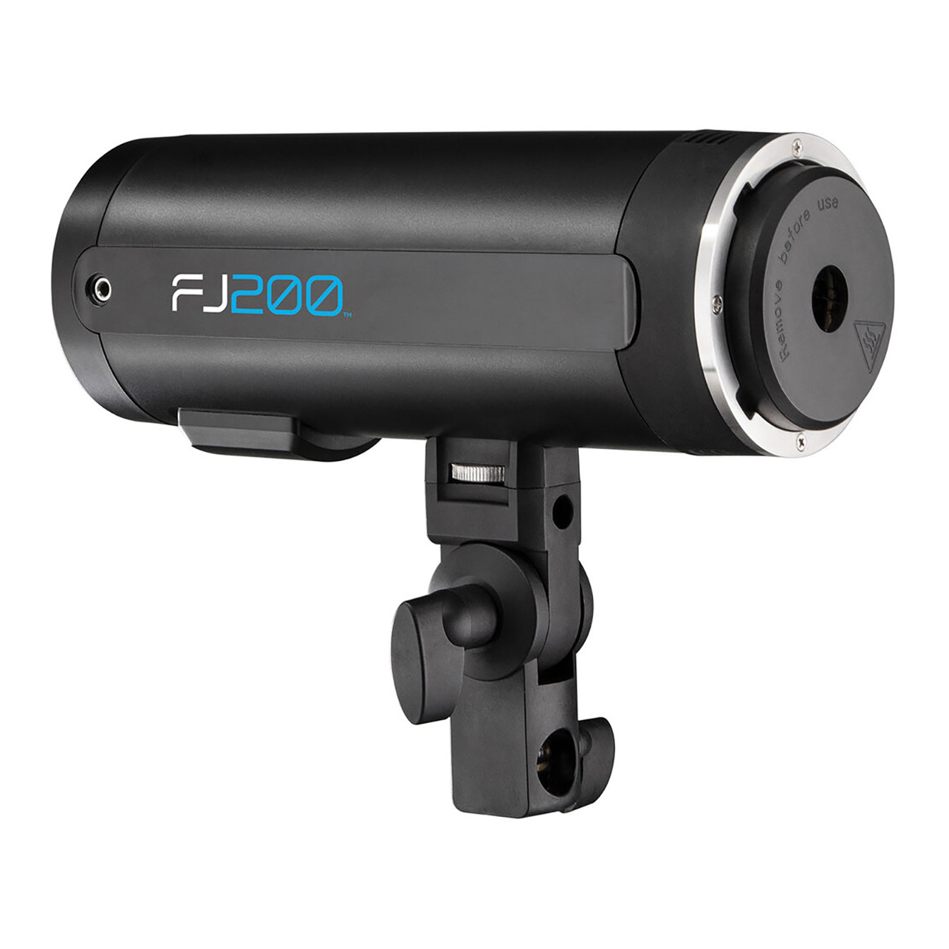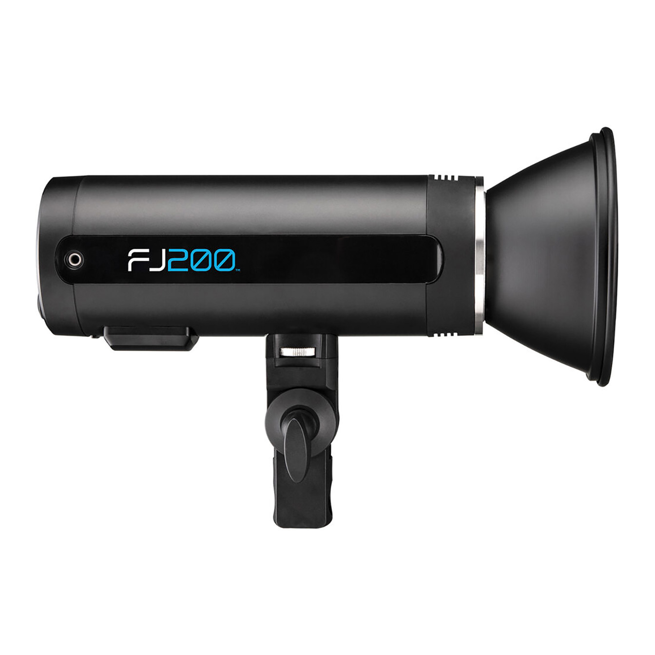 The FJ200 offers a broad 9-stop power range adjustable in 0.1-stop increments, with rapid recycle times of 0.5 to 1.3 seconds. It can freeze action with a peak flash duration of 1/20,000 second in Freeze Mode, is capable of 20 fps, and supports High-Speed Sync (HSS) up to 1/8000 second, along with front and rear curtain sync.